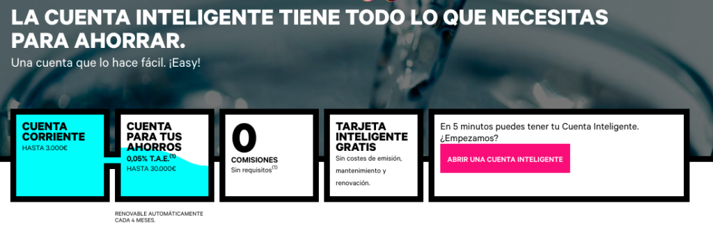 - La Cuenta Inteligente EVO facilita el ahorro casi sin ningún esfuerzo: cuando se llega a los 3000€ en la cuenta corriente, lo siguiente se pasa automáticamente a la cuenta de ahorro que va ligada (son dos cuentas en una) para así facilitar el no gastar más de lo necesario.